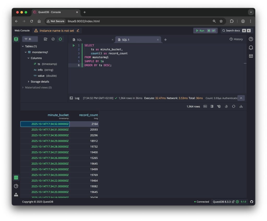See the pictures, a simple test with 30 Python clients publishing topics to the broker. It stores 20 kHz of data into a QuestDB instance without issues.
